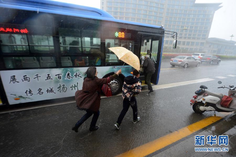 4月12日,人们在风雨中艰难出行。当日下午,江苏扬州遭遇大风暴雨天气,气温骤降,恶劣天气持续近一个小时,给市民出行带来不便。 新华社发(孟德龙 摄)