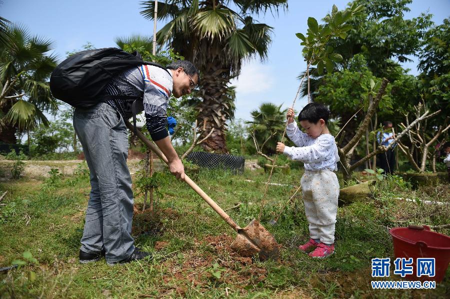 当日,广西南宁市海茵国际花城幼儿园组织部分孩子和家长,开展“共栽一片绿,家园森呼吸”公益植树活动,让孩子们从小亲近大自然,热爱大自然,争做绿色生态环境的耕耘者。新华社记者陆波岸摄