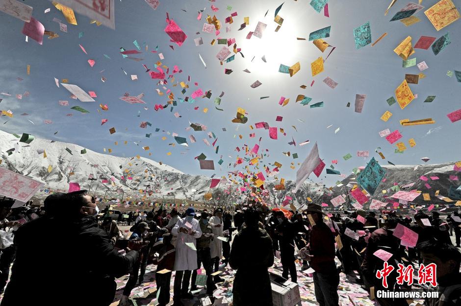 4月11日藏历年2月22日,青海省玉树州称多县格察卓木其古村藏族民众迎来传统节庆“糌粑节”,男女老少互洒糌粑以示祝福。糌粑节为当地传统的春耕祭祀仪式,其渊源与本教习俗有关,传承千年,卓木其经堂中供奉的神鸟,在糌粑节当日被村民抬出进行祭祀,相传该神鸟是嘎朵觉悟神山的管家,它的颈项上挂着一串钥匙,据说是开启尕朵觉卧神山财富、智慧、健康、福寿宝库的钥匙。祭祀神鸟是糌粑节的一部分,人们通过互洒糌粑祈福,祛灾。图为“糌粑节”开始前的祭祀活动。中新社发 仁青尼玛 摄