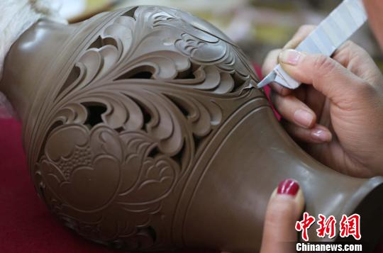 4月12日,在沁阳市神农陶文化产业园区,工艺师精雕细琢。“神农陶”的烧造有72道工序,运用堆塑、浮雕、透雕、影雕等不同手法制作完成。 杨正华 摄