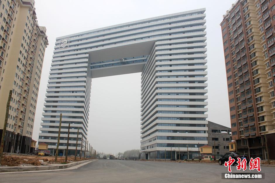 4月13日,河南省鹤壁市淇滨区淇水大道与珠江路交汇处,一栋即将完工的高层建筑横跨马路而立,外观酷似一个板凳,引得经过的市民纷纷驻足观看,连声称奇。据了解,“板凳大楼”是鹤壁市“9+1”重点工程项目之一,为河南省首座跨路景观大厦,占地面积41亩,总建筑面积约9万平方米,总投资约4.5亿元,由两栋高约86米的建筑横跨在珠江路两侧,宛如“龙门”形状。马义恒 摄