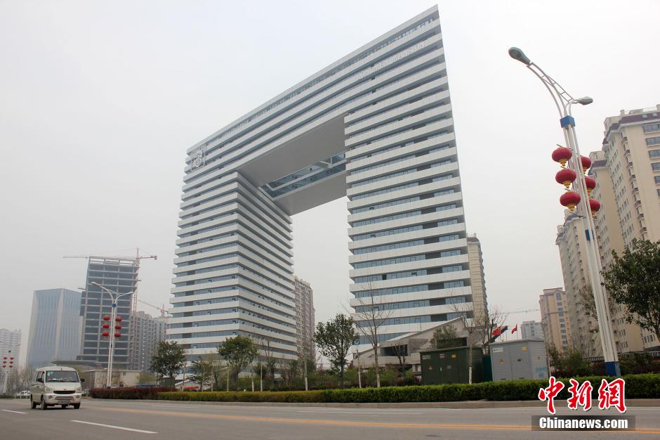 4月13日,河南省鹤壁市淇滨区淇水大道与珠江路交汇处,一栋即将完工的高层建筑横跨马路而立,外观酷似一个板凳,引得经过的市民纷纷驻足观看,连声称奇。马义恒 摄