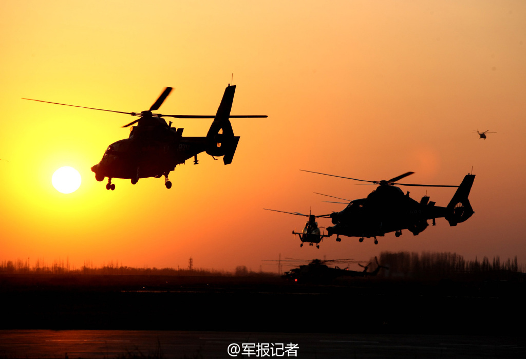 直升机编队跨昼夜训练:迎着朝霞和落日飞行