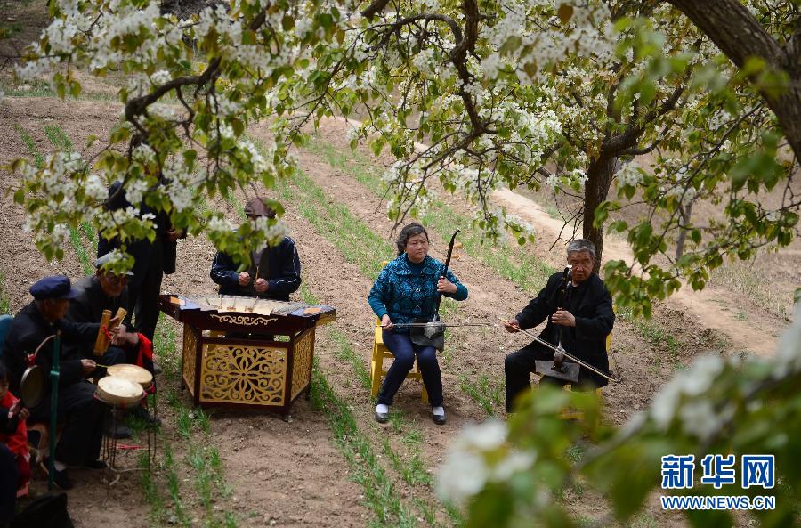 4月12日,靖远县兴隆乡大庙村的乡村自乐班在梨园排练。
