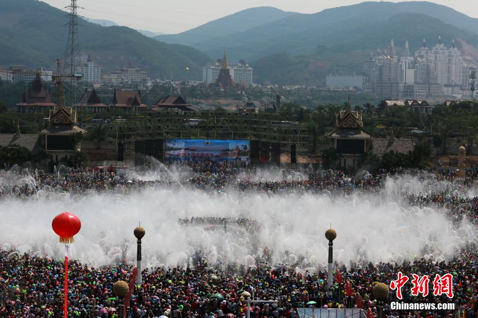 2015年4月15日,云南省西双版纳傣族自治州,当是2015年西双版纳泼水狂欢节,也是傣历1377年新年节系列活动之一,数万名当地群众穿上节日盛装,和外地游客一起在云南省西双版纳傣族自治州景洪市泼水广场互相泼水,互祝吉祥、幸福、健康。泼水节是傣族人民送旧迎新的传统节日,已有上千年历史。图为4月15日,人们在景洪市泼水广场参加泼水狂欢活动。 中新社发 郝亚鑫 摄 图片来源:CNSPHOTO