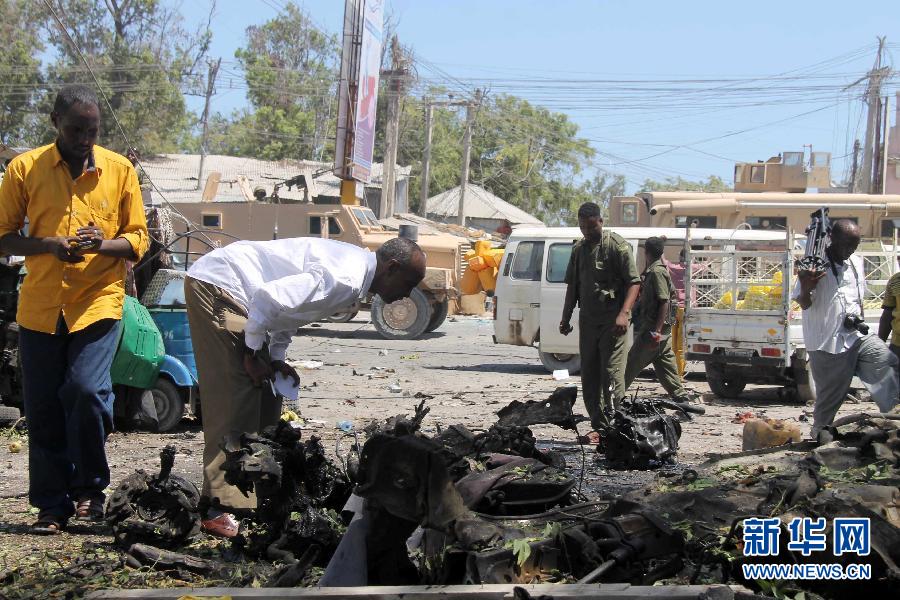 这是4月14日在摩加迪沙拍摄的索马里教育部遇袭现场。索马里教育部14日遭到宗教极端组织“青年党”武装分子袭击。政府军击毙了所有袭击者。新华社发(费萨尔·伊塞摄)