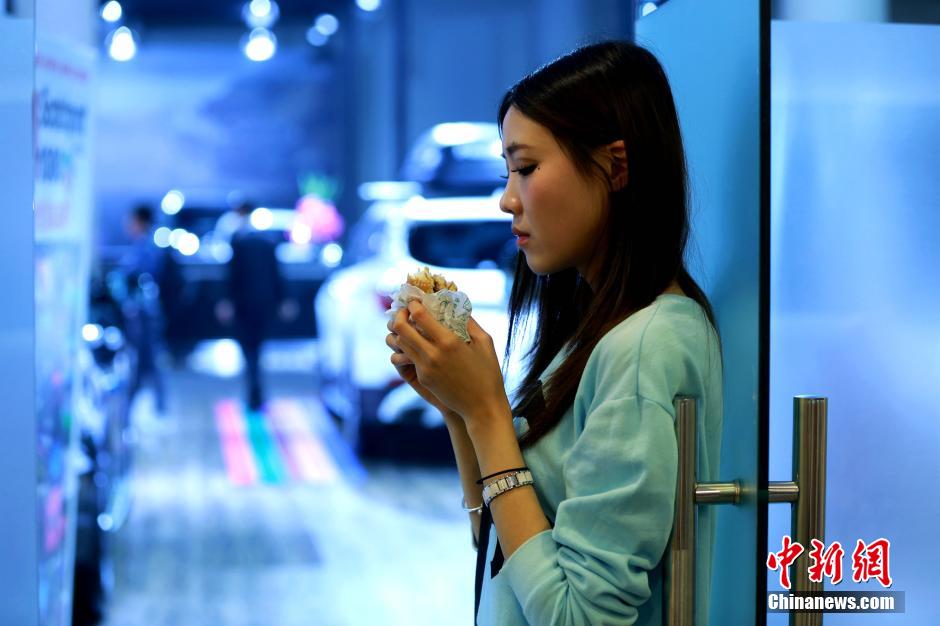 车展间隙抓紧时间随便吃点东西垫垫肚子,准备应付接下来的工作。四五天车展站下来,腿肿了,脚磨破了,脸也笑僵了。梁犇 摄