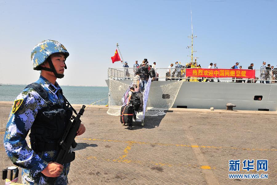 (资料照片)3月29日中午,中国海军第十九批护航编队临沂舰抵达也门亚丁港执行撤离中国公民任务,临沂舰舰员进行安全警戒。根据习主席和中央军委命令,中国海军舰艇编队赴也门执行撤离中国公民任务。新华社发(熊利兵摄)