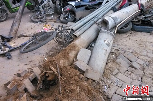 事发现场,路边的两根线杆被从根部推倒。卢朝永 摄