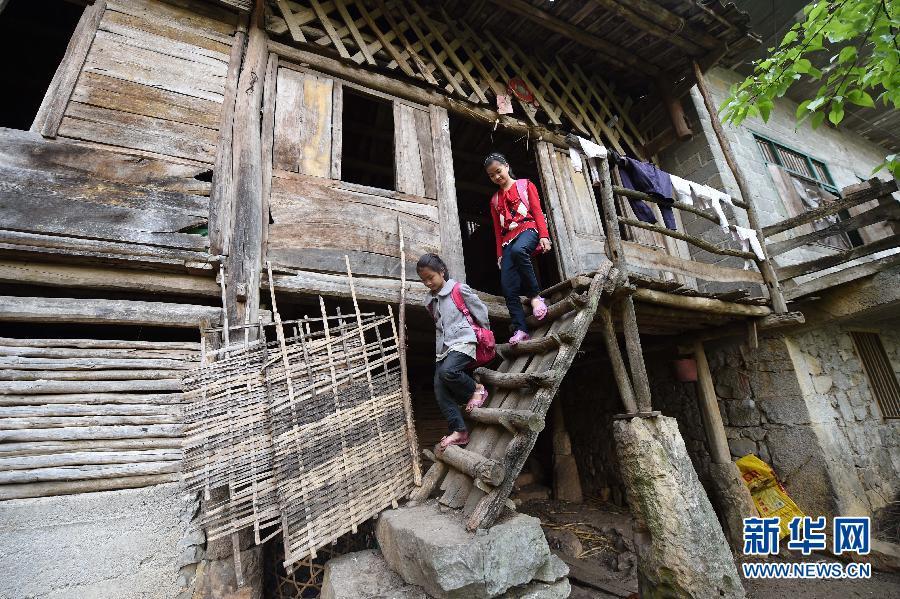 4月14日,蓝晓萍(后)和妹妹蓝云萍走出家门准备上学。新华社记者 陆波岸 摄 图片来源:新华网
