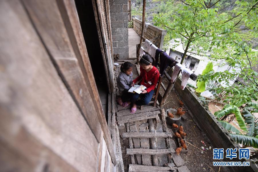 4月14日,蓝晓萍(右)和妹妹蓝云萍坐在家门口看书。新华社记者 陆波岸 摄 图片来源:新华网