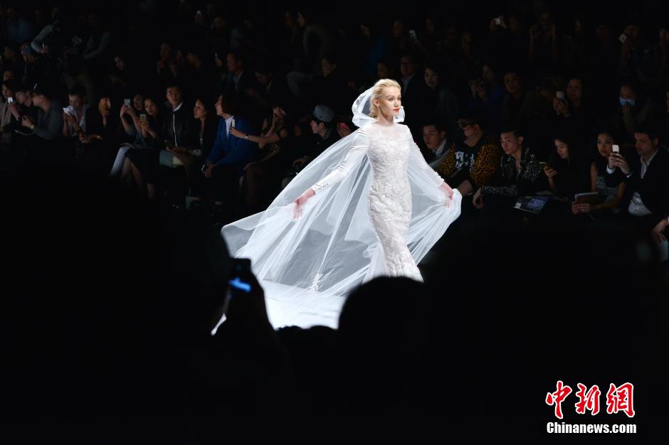 4月14日,2015秋冬上海时装周WTC高级定制婚纱系列作品展示在上海新天地太平湖秀场举行。设计师Daniel Wang凭借独特的设计理念及时尚敏锐度,突破既定的婚纱礼服风格,融入国际时尚元素,简单利落的线条、奢华繁复的珠工以及顶级的华服面料,将中西婚纱礼服风格完美结合。中新社发 袁婧 摄