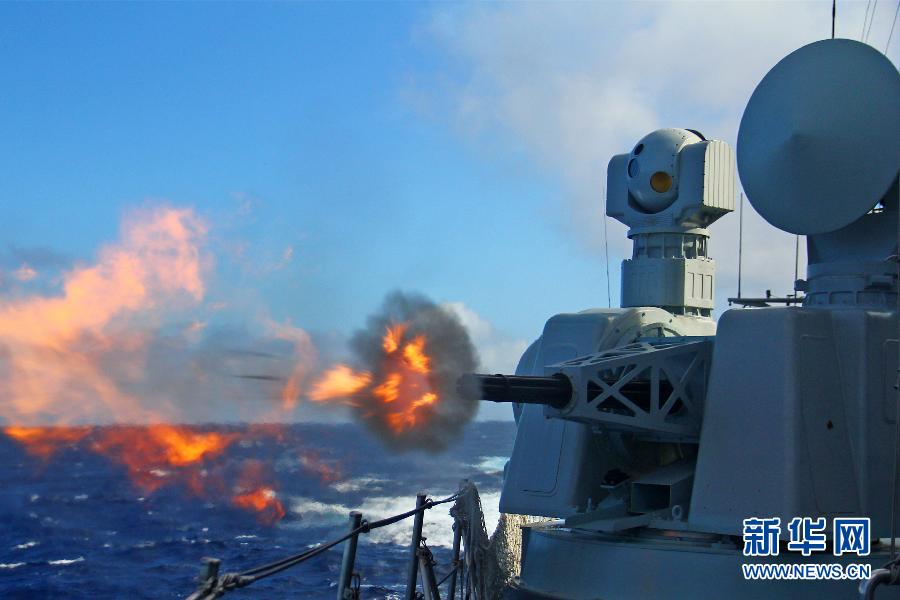 运城舰在海上进行副炮对海射击训练(2014年5月13日摄)。接舰1年,完成试验试航项目260多个,入列1年之内即形成战斗力;入列5年,海上训练时间长达1000多天,创新战法训法30多项;护航亚丁湾,航行总里程达64877海里,多次与外国海军联演联训……海军南海舰队某驱逐舰支队运城舰被誉为能打善战的“深蓝利剑”。新华社发(高毅 摄)
