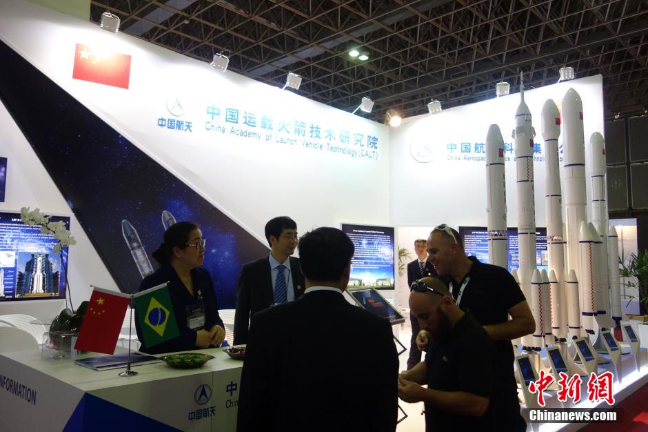 4月14日,为期三天的2015年拉丁美洲航空航天与防务展(简称巴西防务展)在巴西港口城市里约热内卢开幕,来自70余个国家的700多家企业参展。中国国家国防科技工业局组织中国电子进出口总公司、中国船舶重工国际贸易有限公司、保利科技有限公司、中国航天科工集团公司4家国有军贸公司组成"中国防务"国家展团盛装亮相此次展会,重点展出了舰船、导弹、电子信息等领域装备产品,吸引了众多参展商和各国代表的关注。图为中国运载火箭模型受参展商关注。 中新社发 莫成雄 摄