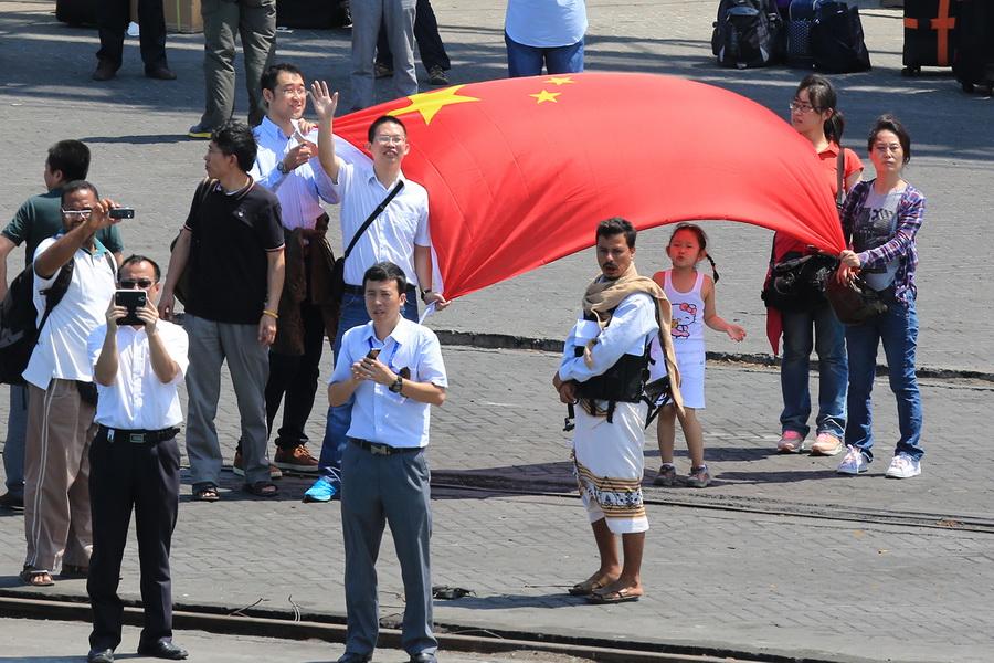 中国同胞在撤离现场举起了鲜艳的五星红旗。熊利兵摄