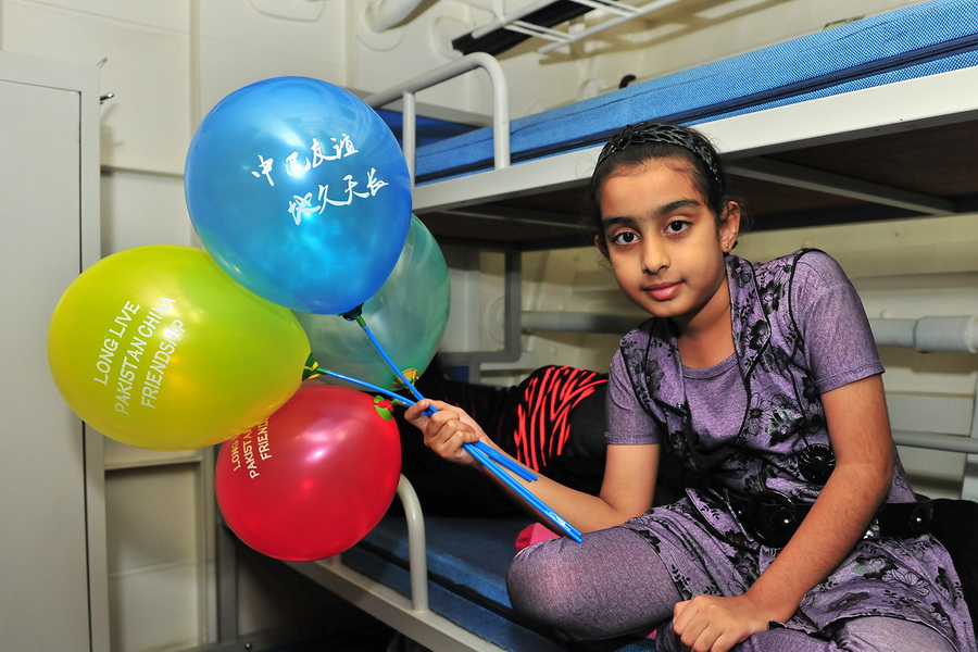 一名巴基斯坦小女孩在海军舰艇的舱室内,手拿“中巴友谊、地久天长”的气球。熊利兵摄