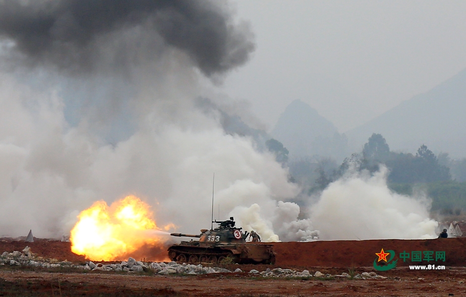 坦克排以火力掩护所属步兵前出清扫路障。张正举摄