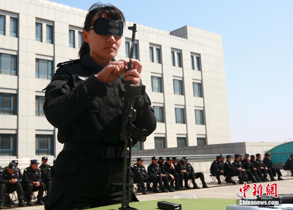 4月15日,在济南公安局特警支队“蒙眼拆装枪械”比武竞赛上,女特警拆装三种枪械,动作快速、娴熟如“庖丁解牛”。中新社发 张勇 摄