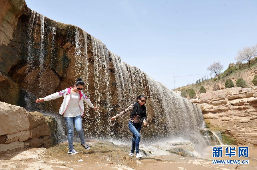 4月15日,游客在欣赏茹河瀑布景观。进入四月以来,宁夏回族自治区彭阳县境内的茹河瀑布在烂漫春花的映衬下别有一番风韵,吸引游客前来观光游览。茹河瀑布位于彭阳县城东24公里之外的城阳乡杨坪村。宽26米,落差9米,气势宏伟,景致壮观,是黄土高原上不可多得的自然景观。新华社记者彭昭之摄
