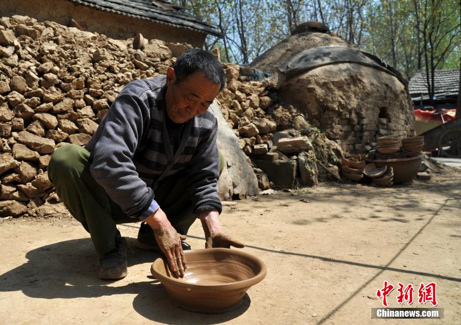 4月15日,在安徽省界首市田营镇,老手艺人计文刚正在烧制陶盆。中新社发 韩苏原 摄