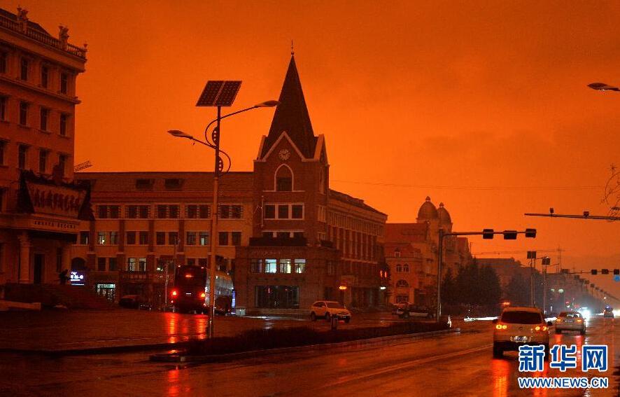这是笼罩在红色中的阿尔山市街头(4月15日摄)。当日下午2点左右,内蒙古阿尔山市出现红色尘霾笼罩天空,并下起小雨,致使当地能见度极低,宛如黄昏。约1小时后,天空逐步恢复正常。 新华社记者 任军川 摄 图片来源:新华网