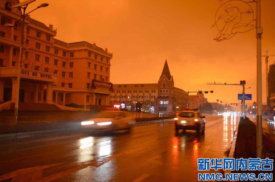 4月15日下午2点左右,内蒙古阿尔山市惊现红色天空,并伴有小雨,雨水中含黑色物质。2点40分,红色天空开始消散,2点50分,天空恢复正常。王靖 摄 图片来源:新华网