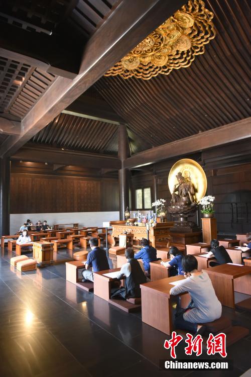 图为善信在如意轮观音像前抄写心经。中新社发 张宇 编