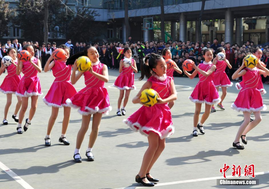 4月15日,学生“足球宝贝”表演足球啦啦操。当日,山东师范大学附属小学“班级足球联赛”在济南启动,联赛涵盖学校所有班级,以期普及校园足球,培养足球后备人才。中新社发 张勇 摄