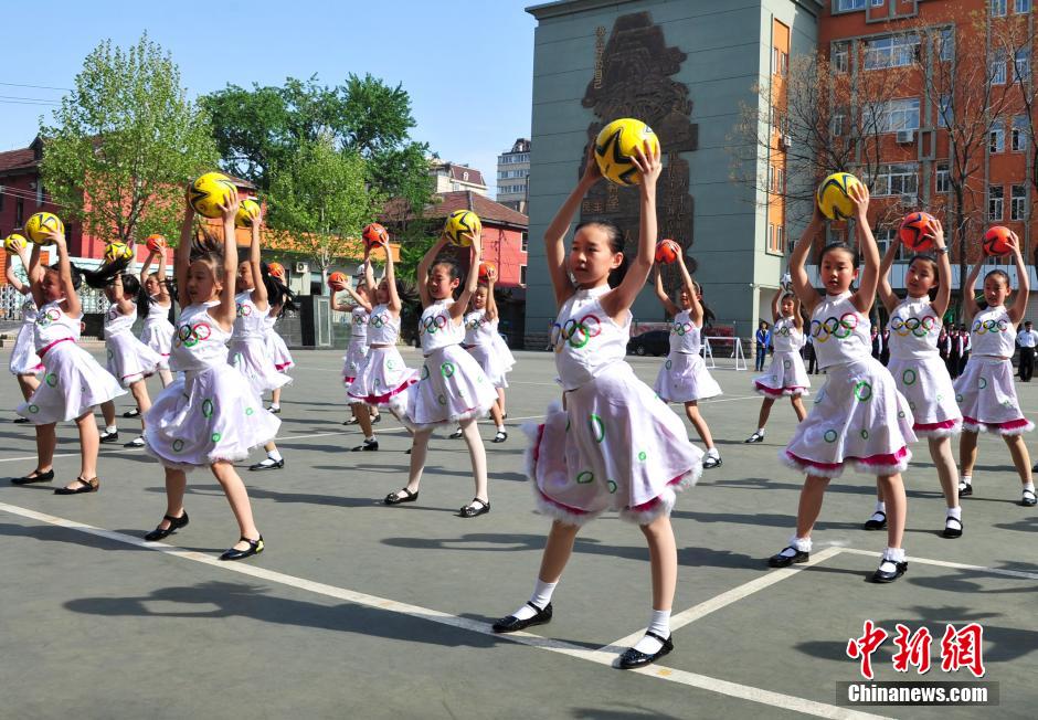 4月15日,学生“足球宝贝”表演足球啦啦操。当日,山东师范大学附属小学“班级足球联赛”在济南启动,联赛涵盖学校所有班级,以期普及校园足球,培养足球后备人才。中新社发 张勇 摄