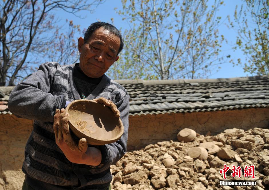 4月15日,在安徽省界首市田营镇,老手艺人计文刚正在烧制陶盆。界首“十三窑”,位于颍河南岸古窑址即指卢窑、魏窑、计窑等十三个窑口,每个村子的村民大都以冶陶为生,并且村子均以陶窑为名,后称为“十三窑”,主要生产三彩刻花陶、民风陶、建筑陶等,这门流传千年的古老制陶技艺,也一直保留和继承了祖传的传统三彩刻画陶瓷工艺,在造型、制坯、配料、上釉,烧制等方面有着自己的独到之处,其历史可追溯到唐宋时期,盛行于明清,流传至今。现延伸为界首彩陶,并被中国文化部公布为首批国家级非物质文化遗产保护项目。中新社发 韩苏原 摄