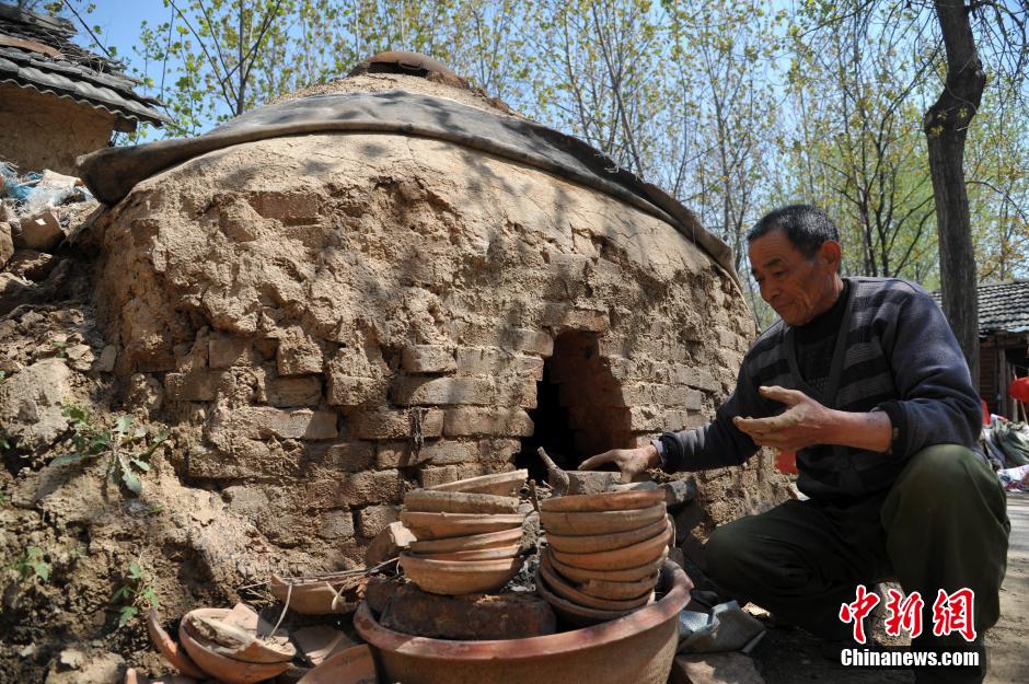 4月15日,在安徽省界首市田营镇,老艺人计文刚正在整理自家窑洞。中新社发 韩苏原 摄