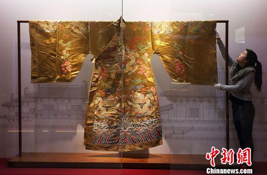 工作人员正在布置云锦展品-清·琉球王妆花缎龙袍(复制品)。泱波 摄