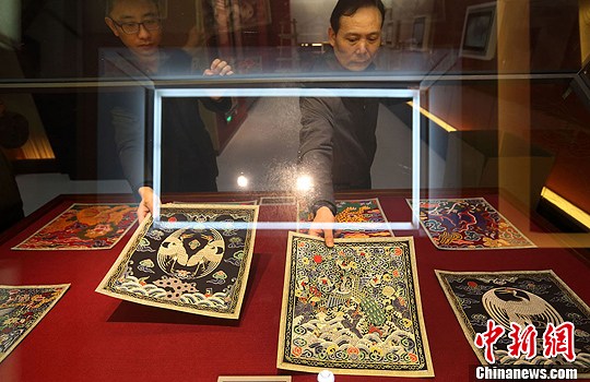 工作人员布置云锦展品--清·文官补系列(复制品)。泱波 摄