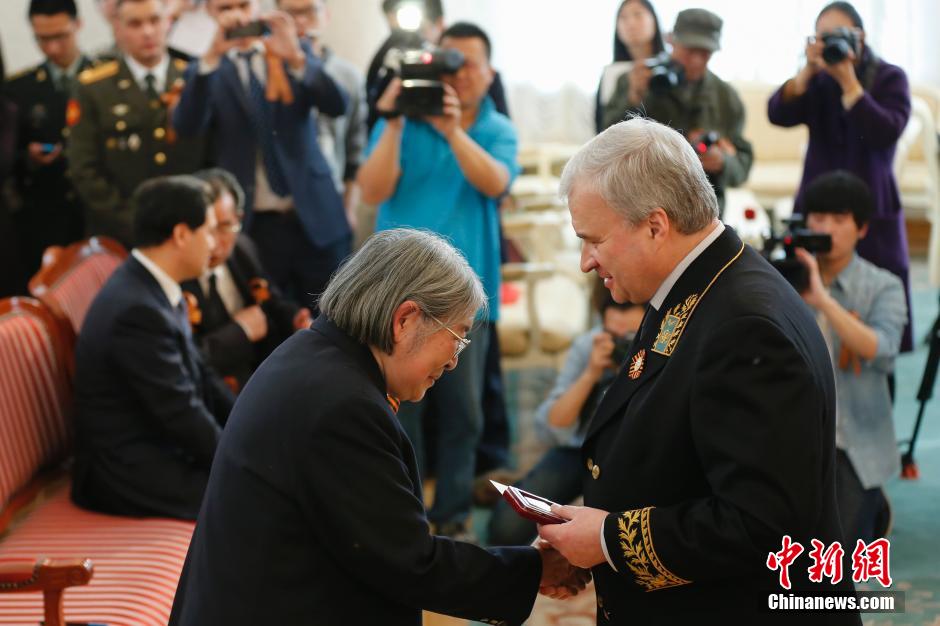 4月15日,毛泽东之女李敏(左)从俄罗斯驻华大使安德烈·杰尼索夫(右)手中接过“1941年-1945年伟大卫国战争胜利70周年”纪念奖章。当日,俄罗斯驻华大使馆举行向中国老兵授予“1941年-1945年伟大卫国战争胜利70周年”纪念奖章仪式。俄罗斯驻华大使安德烈·杰尼索夫代表俄罗斯联邦总统为32名中国老兵颁发奖章。该纪念奖章授予为俄罗斯伟大卫国战争的胜利事业(在战场或在后方)做出了贡献的俄罗斯公民及外国公民以及无国籍人士。中新社发 王骏 摄