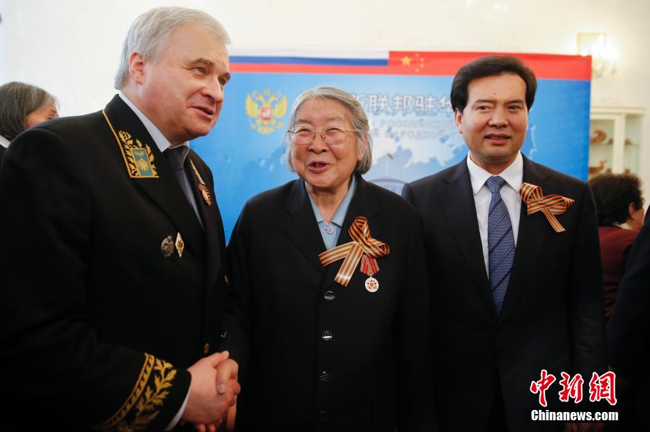 4月15日,毛泽东之女李敏(中)与全国政协副主席、中央统战部副部长王正伟(右)、俄罗斯驻华大使安德烈·杰尼索夫(左)在授予仪式上合影。当日,俄罗斯驻华大使馆举行向中国老兵授予“1941年-1945年伟大卫国战争胜利70周年”纪念奖章仪式。俄罗斯驻华大使安德烈·杰尼索夫代表俄罗斯联邦总统为32名中国老兵颁发奖章。该纪念奖章授予为俄罗斯伟大卫国战争的胜利事业(在战场或在后方)做出了贡献的俄罗斯公民及外国公民以及无国籍人士。中新社发 王骏 摄