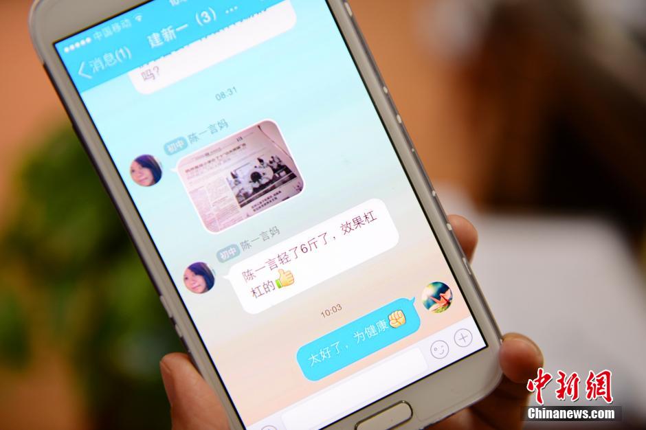 4月15日,杭州建新小学一名老师给家长发送微信报告孩子的减肥成果。2014年期末的体质测查显示,该校858名学生中有5%的孩子BMI指数处于肥胖,而其中最重的一个孩子读五年级,身高1.61米,体重却达到了81公斤。为此,学校设立“熊猫班”给超重的4名小胖墩儿们集体减肥,其中效果最好的学生成功减重6斤。中新社发 李晨韵 摄