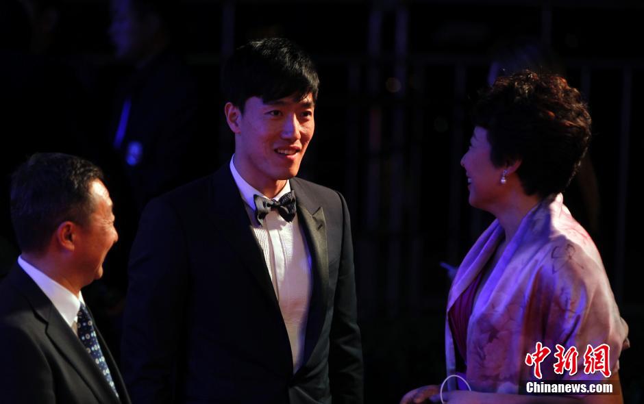 4月15日晚,2015年第16届劳伦斯世界体育奖颁奖礼在上海大剧院隆重举行,刘翔应邀出席本次体育盛典。图为刘翔在与女排运动员冯坤交谈。中新社发 汤彦俊 摄