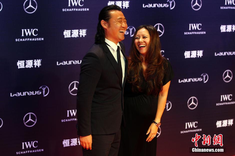 4月15日晚,2015年第16届劳伦斯世界体育奖颁奖礼在上海大剧院隆重举行,作为最佳女运动员候选者之一的中国网球选手李娜亲临现场出席奖颁盛典。图为李娜、姜山劳伦斯颁奖盛典秀恩爱。中新社发 汤彦俊 摄