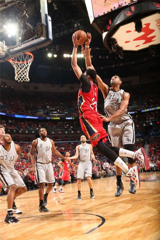 在今天必须取胜才能确定晋级季后赛的情况下,戴维斯再战马刺打得也是毫不含糊。尽管一开始3投全失,但随后,戴维斯迅速调整状态。标志性的中投、挡拆顺下强攻造成邓肯犯规、突破上篮、抢断后的一条龙飞身暴扣,戴维斯在6分半钟左右的时间里4投全中,拿到10分。