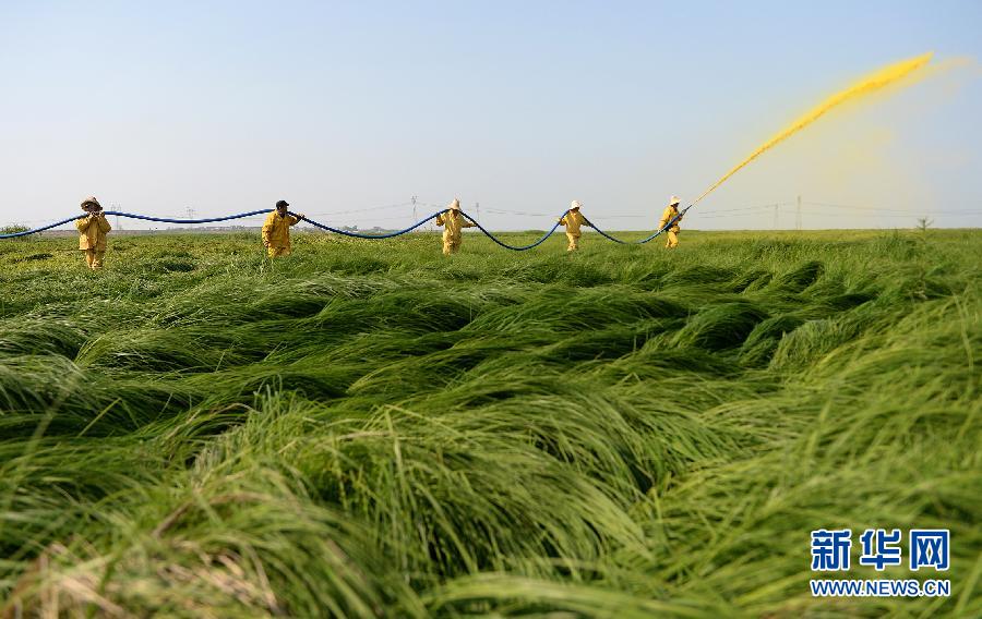 灭螺队队员扛着150米的皮管对重点地区进行药物灭螺(4月14日摄)。