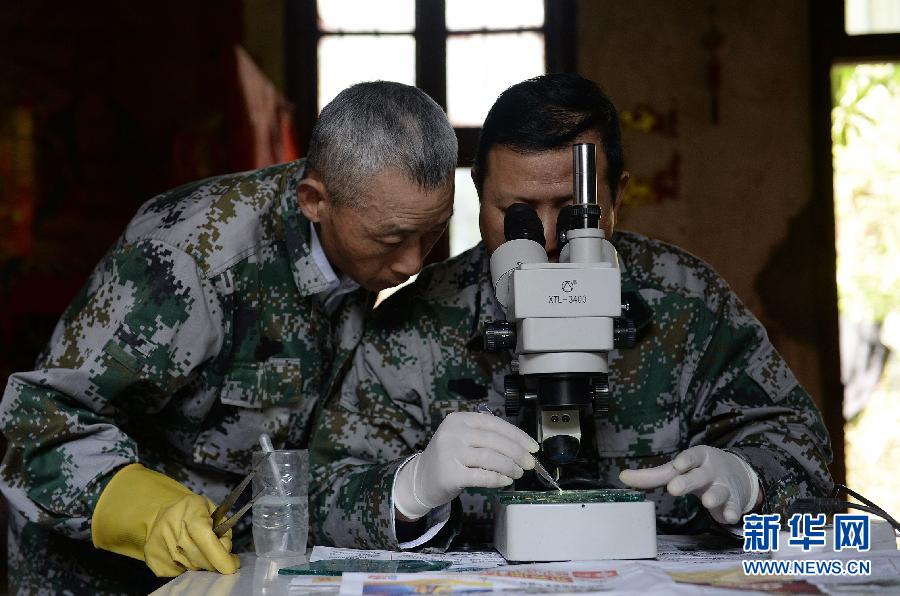 在租住当地农民的房子里,灭螺队员熊林根(右)用显微镜观察当天收集的钉螺样本(4月14日摄)。 新华社记者 万象 摄