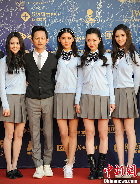 图为《栀子花开》剧组的美女们与何炅。 中新网记者 李卿 摄