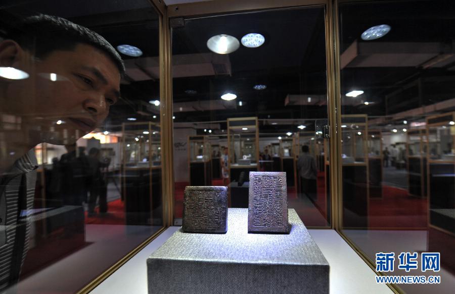 4月16日,长沙市民在湖南文物精品展上观赏展出的古代官印。当日,十枚古代官印在长沙举办的湖南文物精品展上展出。据了解,官印是国家行政官爵等级制度的象征,存世稀少,在民间很难觅到。每方官印都有其唯一性,一个职位只会铸一方官印,只有当原印遗失损坏才会另行铸造,且不会有两方一模一样,是研究历史不可多得的重要实物对照资料。新华社记者 龙弘涛 摄
