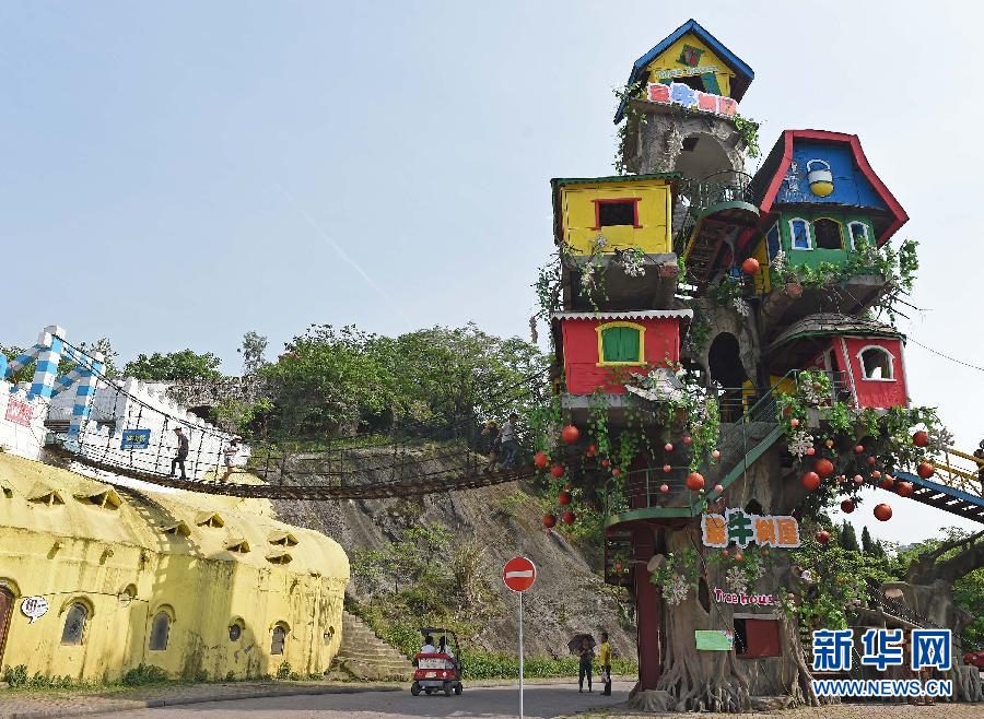 4月16日,洋人街景区“最牛树屋”吸引游客前来体验。当日,重庆市美心洋人街景区“最牛树屋”正式对游客开放。“树屋”最高处距离地面有20米,共设有9间小屋,游客可以在小屋内进行免费的K歌、下象棋等娱乐活动。新华社记者 陈诚 摄
