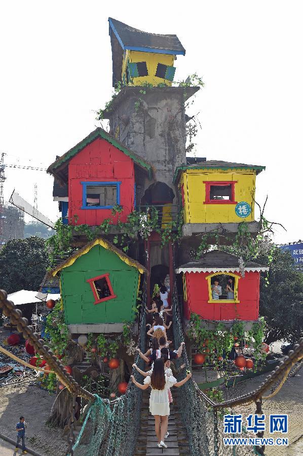 4月16日,洋人街景区“最牛树屋”吸引游客前来体验。当日,重庆市美心洋人街景区“最牛树屋”正式对游客开放。“树屋”最高处距离地面有20米,共设有9间小屋,游客可以在小屋内进行免费的K歌、下象棋等娱乐活动。新华社记者 陈诚 摄
