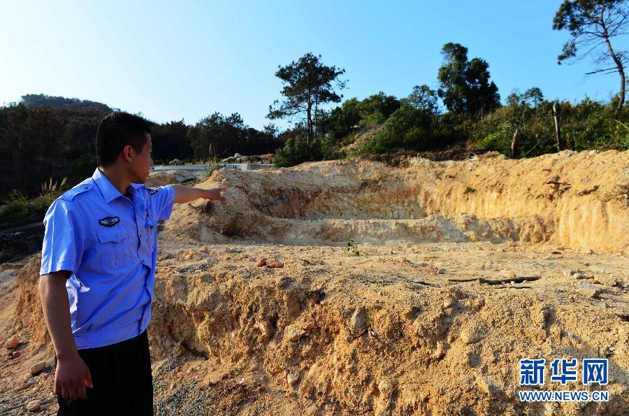 4月16日,在福清市海口镇洋坂村的一座山头上,福清森林公安民警在调查一座占地800多平方的墓穴。 新华社记者魏培全摄