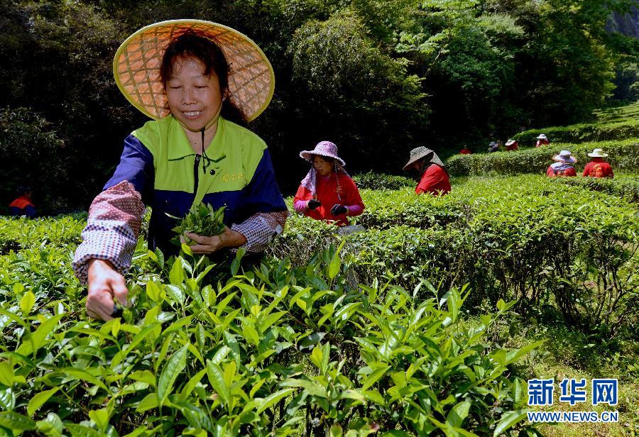 4月16日,福建武夷星茶叶有限公司茶农在“喊山”仪式后上山采茶。清明过后,福建武夷山漫山遍野的茶树吐出新绿,进入春茶生产的繁忙季节,当地茶农按照传统习俗陆续举行“喊山”仪式,上山采茶。武夷山市是福建茶叶的主产区,目前全市茶山面积14.8万亩,年产茶叶7800吨,年产值15.8亿元,茶叶生产已成为当地农民致富的支柱产业。新华社记者 张国俊摄