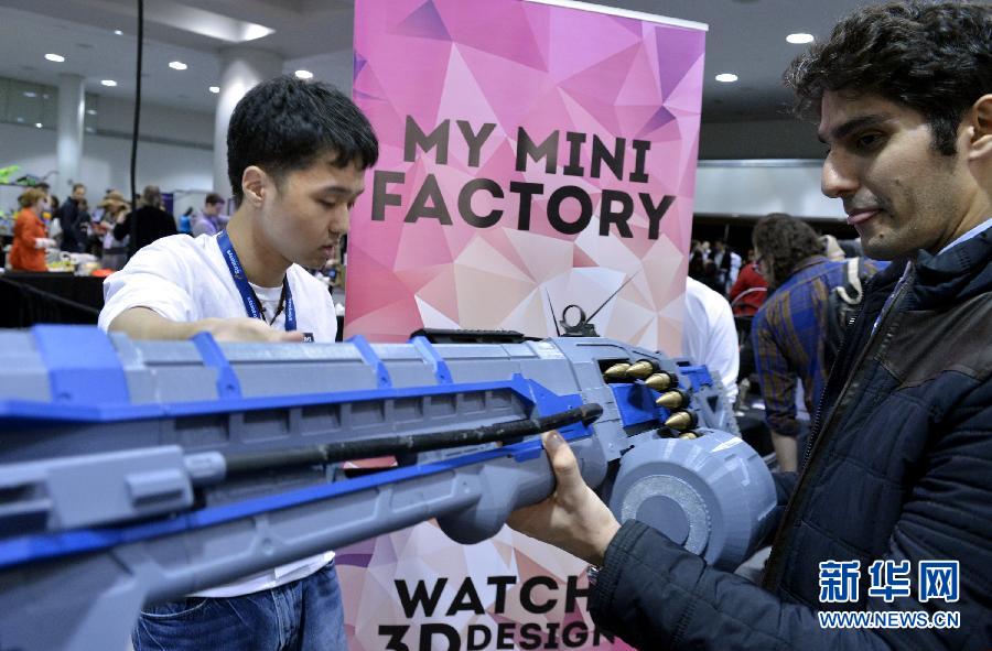 4月16日,在美国纽约,一名参观者感受用3D技术打印的仿真枪。当日,展示3D打印最新工业设计和3D打印相关科技的纽约3D打印设计展开幕,来自20多个国家的40多家3D打印领域参展商进行产品展示和互动,分享3D打印的最新动态和成果。新华社记者王雷摄