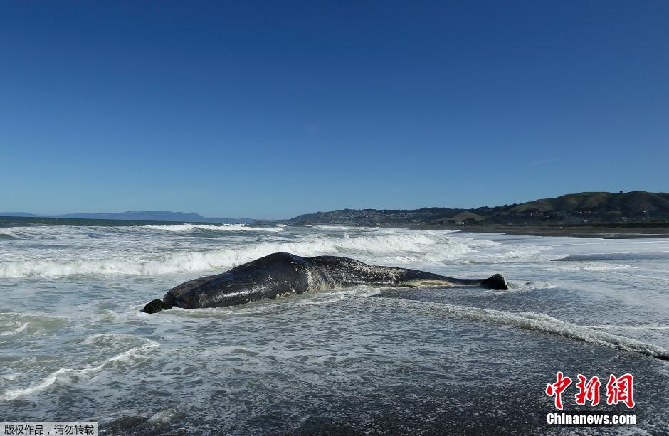图为被冲上岸的抹香鲸尸体。