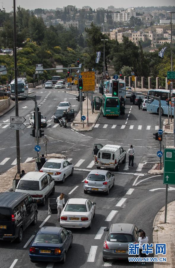 4月16日,在耶路撒冷大卫塔前的街道上,人们下车为大屠杀遇难者默哀。当日上午10时,两分钟的防空警报响彻以色列各地,司机下车,行人止步,为二战中大屠杀遇难者默哀两分钟。以色列大屠杀纪念日根据犹太历法确定,今年的纪念日自4月15日日落开始,至16日日落结束。今年的主题是“痛苦的解放和重返生活——二战结束70年”。新华社记者李睿摄